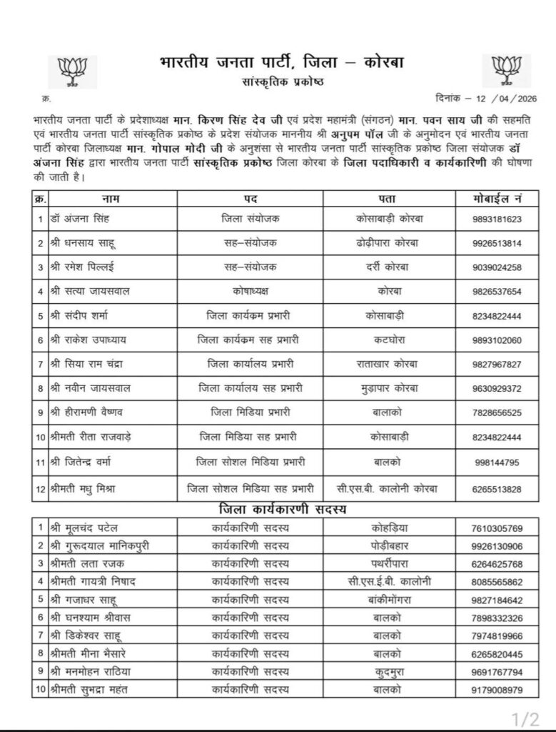 कोरबा (न्यूज़ वाला)। भारतीय जनता पार्टी के प्रदेशाध्यक्ष किरण सिंह देव एवं प्रदेश महामंत्री (संगठन) पवन साय की सहमति तथा भाजपा सांस्कृतिक प्रकोष्ठ के प्रदेश संयोजक अनुपम पॉल के अनुमोदन एवं भाजपा जिलाध्यक्ष गोपाल मोदी की अनुशंसा पर भाजपा सांस्कृतिक प्रकोष्ठ जिला कोरबा की नई कार्यकारिणी एवं पदाधिकारियों की घोषणा की गई है।