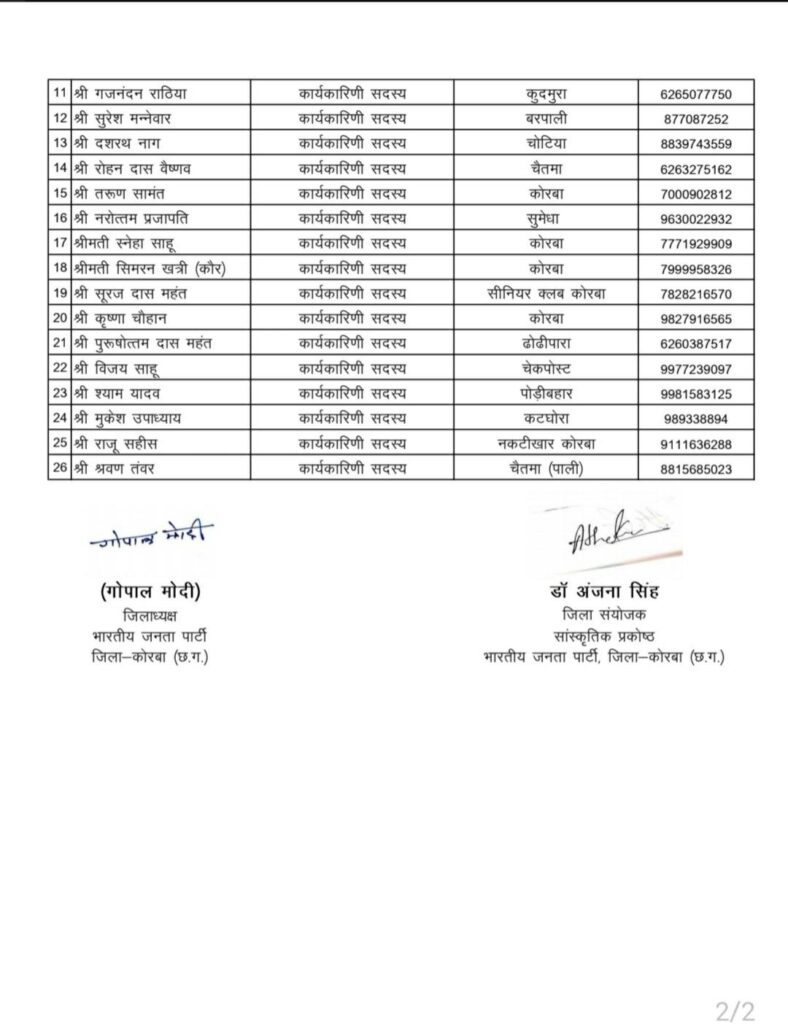 भाजपा सांस्कृतिक प्रकोष्ठ जिला कोरबा के पदाधिकारियों व कार्यकारिणी की घोषणा