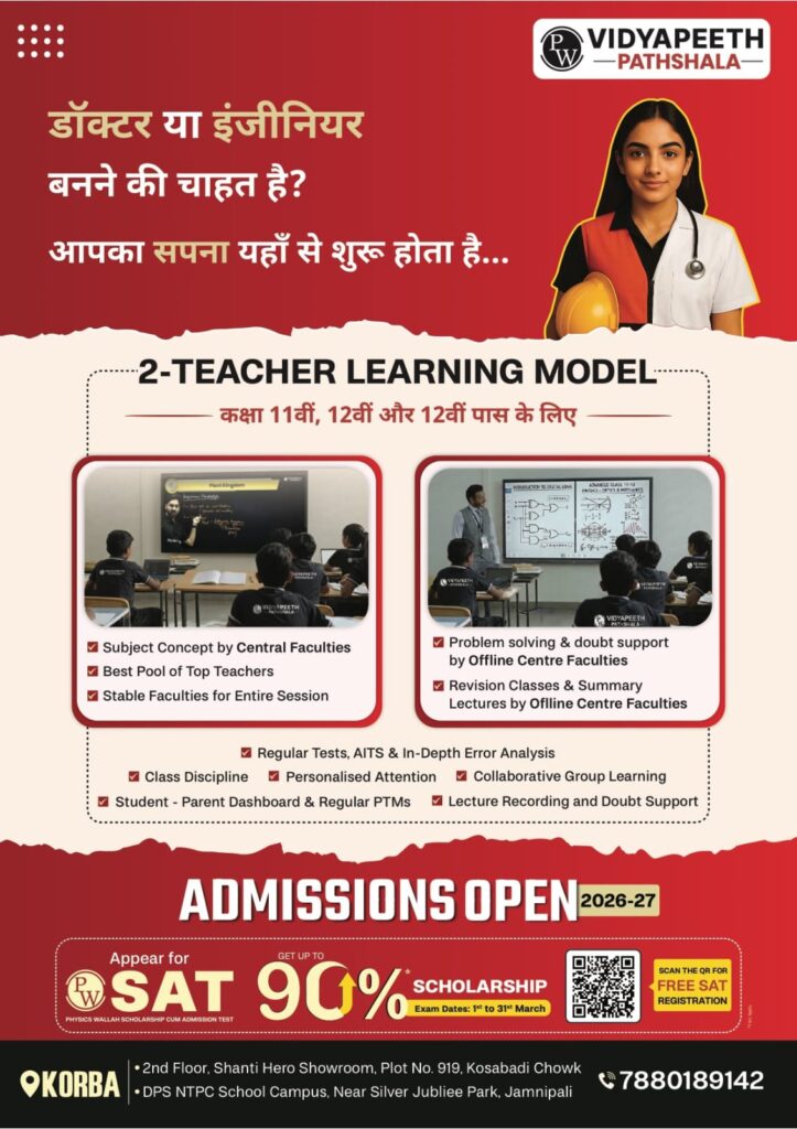 इस मॉडल के तहत सेंट्रल फैकल्टी द्वारा कॉन्सेप्ट क्लासेस कराई जाएंगी, जबकि सेंटर पर डाउट सॉल्विंग और प्रैक्टिस सेशन आयोजित होंगे। साथ ही नियमित रिवीजन और परफॉर्मेंस ट्रैकिंग के जरिए छात्रों की तैयारी को लगातार मॉनिटर किया जाएगा, जिससे वे प्रतियोगी परीक्षाओं के लिए बेहतर तरीके से तैयार हो सकें।छात्रों को आर्थिक रूप से भी राहत देने के लिए संस्थान द्वारा SAT (Scholarship cum Admission Test) आयोजित किया जा रहा है, जिसके माध्यम से 90% तक स्कॉलरशिप प्राप्त करने का अवसर मिलेगा। यह पहल विशेष रूप से उन छात्रों के लिए फायदेमंद होगी, जो सीमित संसाधनों के बावजूद उच्च गुणवत्ता की तैयारी करना चाहते हैं।संस्थान प्रबंधन के अनुसार 1 अप्रैल 2026 से नए बैच शुरू हो चुके हैं और सीमित सीटों के चलते एडमिशन तेजी से भरे जा रहे हैं। ऐसे में इच्छुक छात्रों और अभिभावकों को जल्द निर्णय लेने की सलाह दी जा रही है।शिक्षा विशेषज्ञों का मानना है कि Physics Wallah की यह पहल कोरबा और आसपास के क्षेत्रों के छात्रों के लिए एक बड़ा अवसर है। अब उन्हें IIT-JEE और NEET जैसी राष्ट्रीय स्तर की परीक्षाओं की तैयारी के लिए बाहर जाने की आवश्यकता नहीं होगी, जिससे समय और खर्च दोनों की बचत होगी और स्थानीय स्तर पर ही गुणवत्तापूर्ण शिक्षा उपलब्ध हो सकेगी।कोरबा में शुरू हुई यह पहल शिक्षा के क्षेत्र में एक बड़ा बदलाव ला सकती है। यह न केवल छात्रों को मजबूत अकादमिक आधार देगी, बल्कि उन्हें राष्ट्रीय स्तर की प्रतियोगी परीक्षाओं में सफलता की दिशा में भी आगे बढ़ाएगी।Physics Wallah विद्यापीठ पाठशाला, कोरबामो. : 7880189142